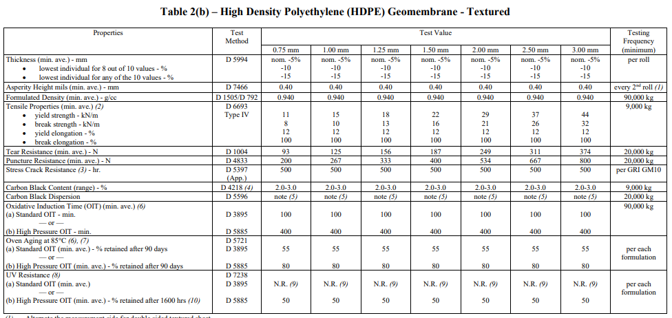 - Được ban hành bởi Viện nghiên cứu địa kỹ thuật (Geosynthetic Research Institute – GRI), tiêu chuẩn này yêu cầu màng HDPE có khả năng chịu lực kéo, độ giãn dài và kháng hóa chất tốt.